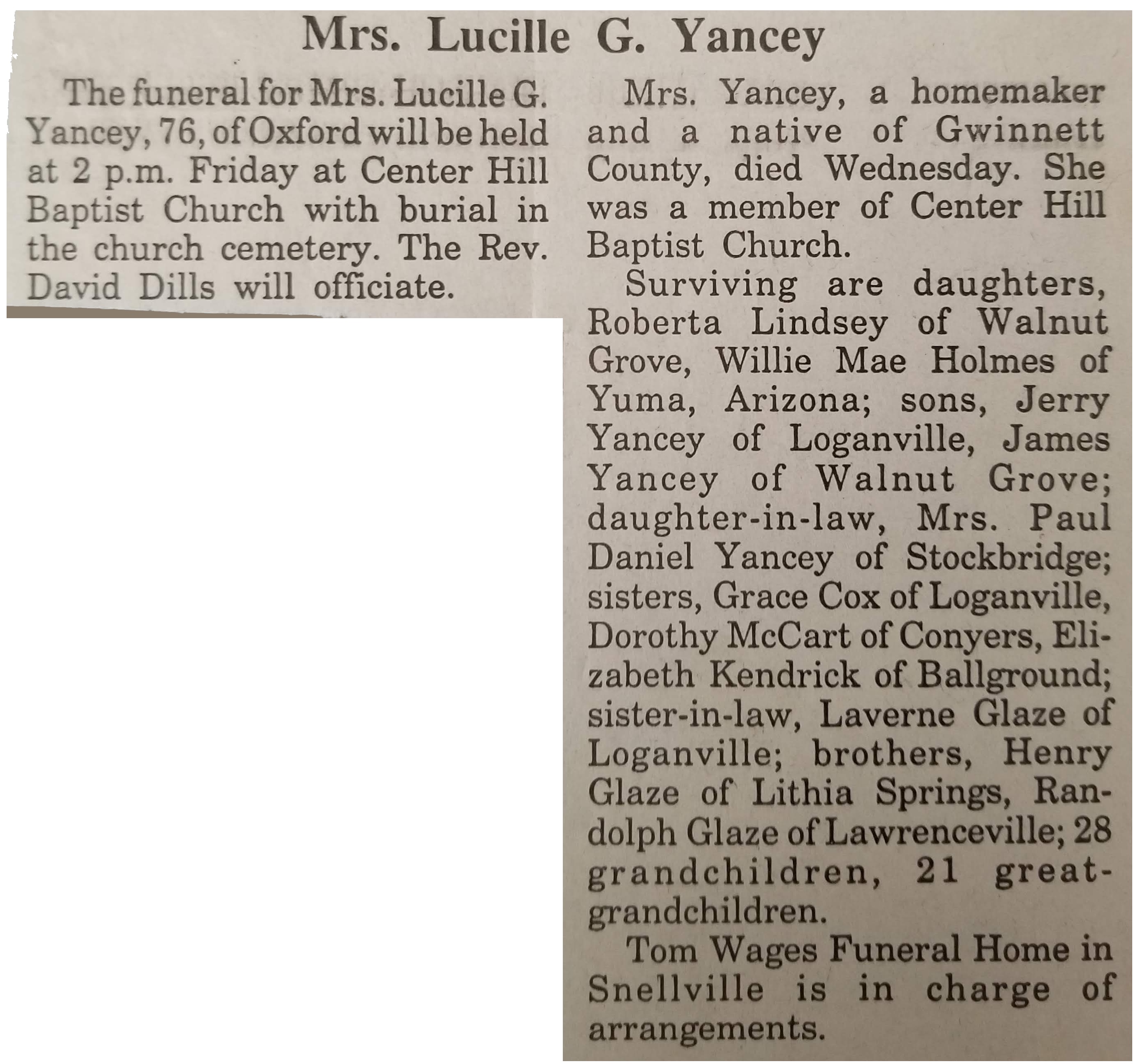 of Lucille Glaze and Willie Jacob Yancey, and the grand daughter of Luther